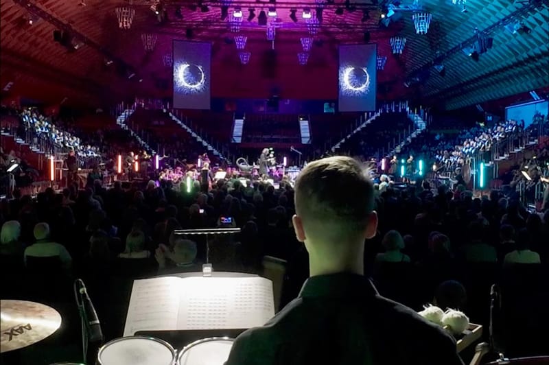 Eventually, on the night of the performance the whole choir was a glittering array of singers in the vast darkened hall. A truly spectacular event, conducted by Paget, lighting up the Halle Munsterland Arena.